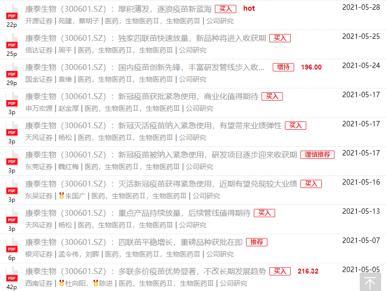 在2021年5月康泰生物股价峰值期间,超过10家券商对其作出“买入”或“增持”或“推荐”评级。