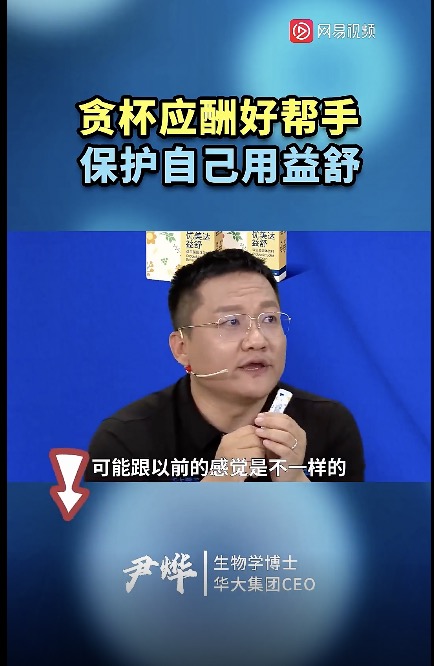在代言的自家益生菌“优美达益舒”时,视频中曾称:益生菌是应酬好帮手,华大同事应酬时经常带这款益生菌,不得不喝的时候,喝之前来一袋,喝几杯后再来一袋。在视频中,尹烨表示,“喝到10杯8杯后,再来一袋,还是会让你感觉和以前是不太一样。”