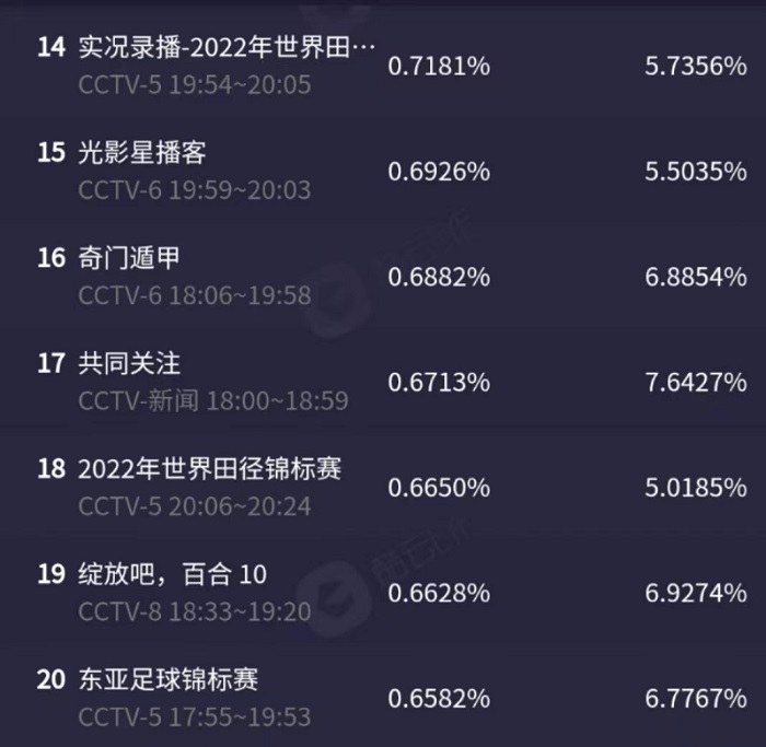 东亚杯在央视的收视数据十分惨淡,甚至比不上2022年田径世锦赛的实况录播回放(收视率全平台排名第14),收视率仅排名第20。