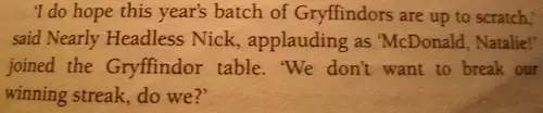 这一段话出现在英版《火焰杯》的第159页。Natalie是一名9岁的加拿大小女孩,她患有白血病,按照当时的情况她无法等到《火焰杯》的出版了。于是J.K. 罗琳在实体书出版一年前发Email给Natalie把故事告诉了她。另外为了向她致意,罗琳在书里加入了她的名字,这样她的记忆就可以永存了。