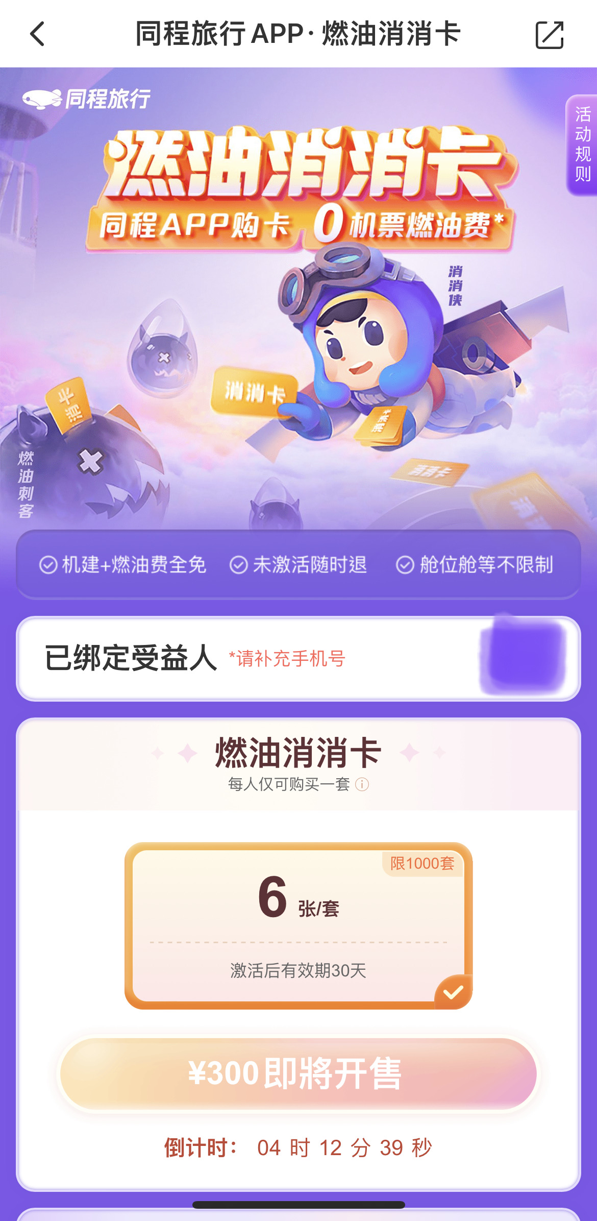 不过,界面新闻记者也注意到,同程旅行推出的“燃油消消卡”并非可随时购买,而是采用了限量销售的方式。同程旅行方面还表示,7月25日至7月29日每天晚上8点,“燃油消消卡”在同程旅行APP平台限量发售,若购买之后未激活,可随时全额退款。