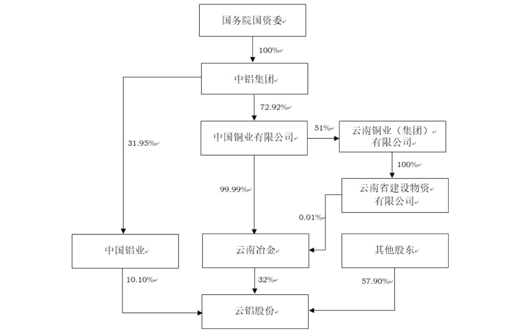 中铝集团直接持有中国铝业31.95%的股份,通过中国铜业有限公司间接持有云南冶金99.99%的股份,中铝集团实际控制人为国资委。