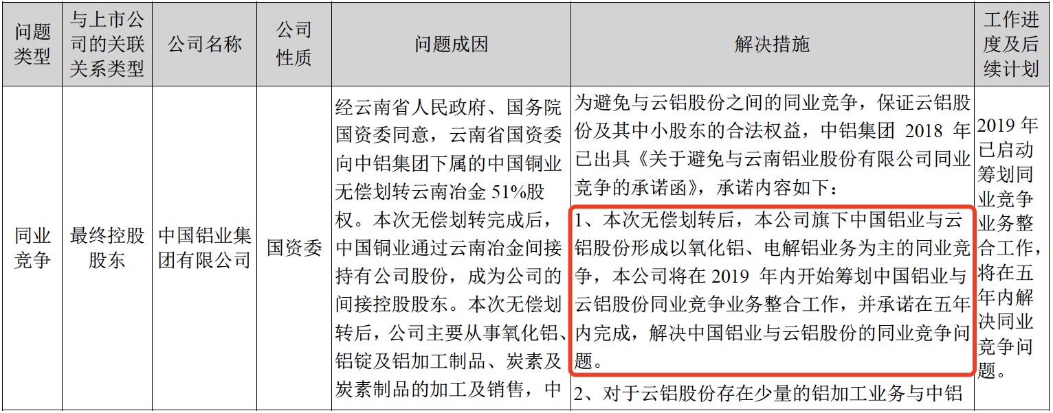 实际上,早在2019年,中铝集团就开始筹划中国铝业和云铝股份同业竞争业务整合工作:2019年1月2日中铝集团向中国铝业出具了《关于避免与中国铝业股份有限公司同业竞争的承诺函》,中铝集团承诺在五年内解决中国铝业与云铝股份的同业竞争问题。