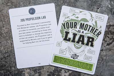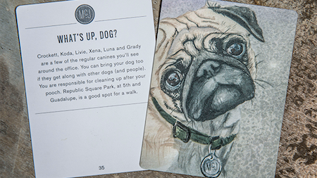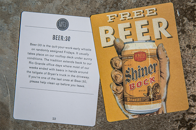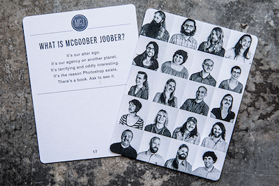 如果你是美国德州广告公司McGarrah Jessee的新员工,上班的第一周会在一场寻宝游戏中度过。在公司内四处游荡、熟悉环境、搭讪新同事的同时,你的任务是必须集齐一副“讲述公司文化”的扑克牌,一共48张 。