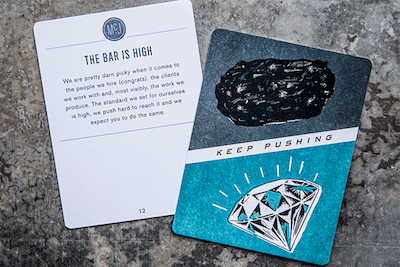 当然,任何一家公司都希望员工能对自身“高标准严要求”,McGarrah Jessee需要你对着这两张扑克牌宣誓就好啦,以及“Keep Pushing”(永远保持一颗进取心)。