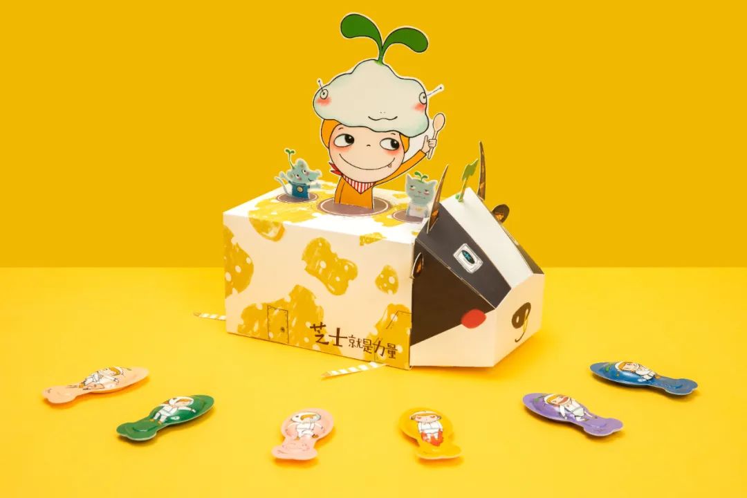 窝小芽塑造了一个眼里有星星,心中有太阳的探索好奇宝宝的IP形象,这款奶酪礼盒包装的灵感基于食育故事:窝小芽有两个朋友,小不点鼠小芽(一直都长不高),和吃不饱猫小芽(一直吃,却吃不饱)但是都想变高长大去争当第一名。小芽驾驶着奶牛飞船前往奶酪星球为长不高的鼠小芽和猫吃不饱小芽寻找长高长大的秘密。包装创作打破传统盒型,原创独属于窝小芽品牌的牛奶飞船造型,让包装给小朋友带来欢乐,赋予包装更深层次的价值。牛奶飞船礼盒采用穿插结构,结合产品主题,充分满足小朋友开发智力和亲子间的互动体验感。