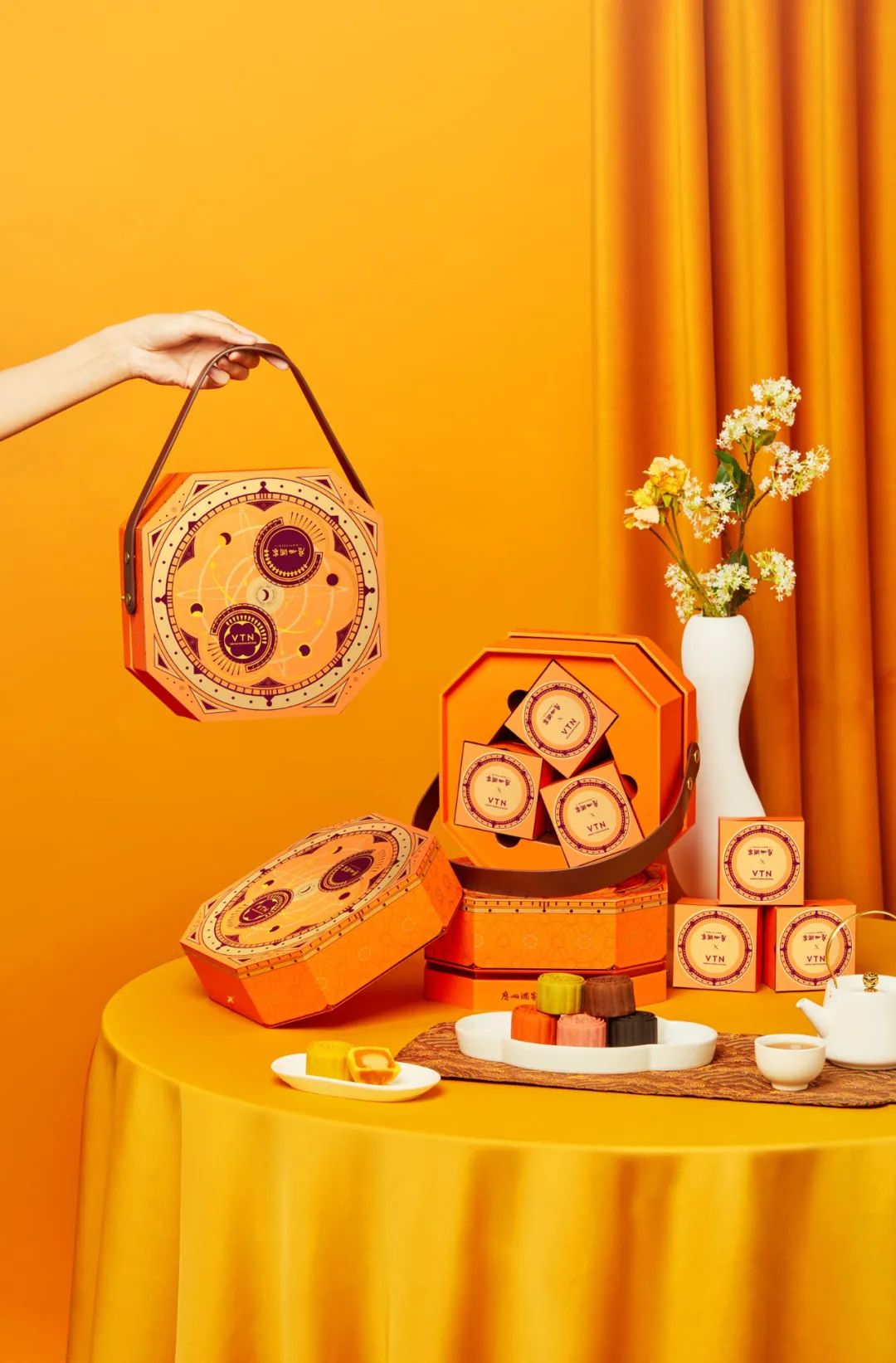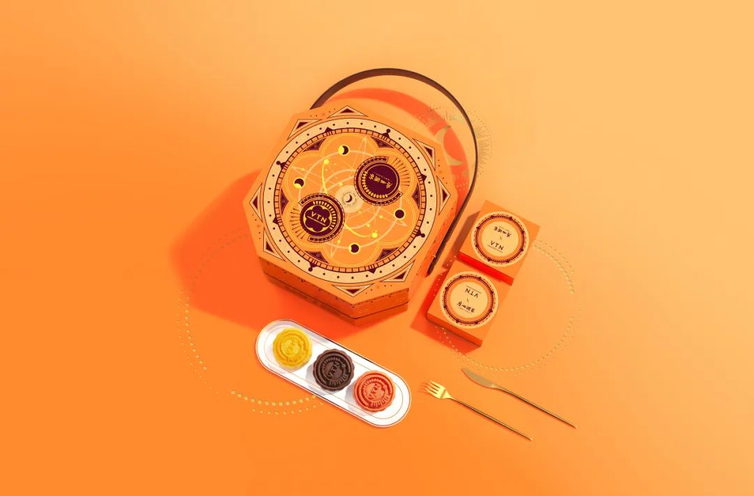 中秋节是中国民间传统节日,更是中国人民弥足珍贵的文化遗产,皓月流光月饼礼盒满足了中秋佳节高端礼赠市场的需求,用创意设计语言和精美工艺技巧呈现在皓月流光月饼礼盒上,礼盒主视觉绘制“钟表、轮盘、宇宙”形态,以圆形几何放射设计手法串联三者,以视觉形象化诠释“时间的味道”主题。礼盒结构参照中国传统宫廷皇家御用食盒的形态,提取八角盒结构形态,寓意四平八稳,安稳吉祥的节日祝愿。视觉色彩的“橘”是中国传统颜色“妃”和“炎”的勾兑调和色,寓意鲜艳华丽、富贵升平的美好生活愿景。