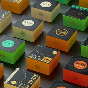 胡桃里中秋礼盒是一款适合中秋佳节送礼的月饼礼盒,在中秋的主题上融入了品牌愿景“四代同堂”,并以此作为灵感提炼了“世代同堂”的设计思路。传统节日不再只是四代同堂的期盼,也可以是每一个异乡游子在褪去工作疲惫后的欢聚时刻。inDare将浓厚的音乐氛围融入此次的月饼礼盒设计,希望在中秋团聚之时,以音乐作为媒介串起每一个世代的联系。打破传统的喜庆配色,我们以高级、复古感的黑金作为主要配色还原黑胶唱片设计,将时尚与复古元素结合,打造符合大众化审美的新式月饼礼盒设计。礼盒的结构是手提式,方便他人送礼。并在月饼放置处做了首饰盒的概念,达到了二次环保利用的形式;我们减少了传统贺卡的方式,改为扫码获得祝福,同时响应减少纸张环保理念。