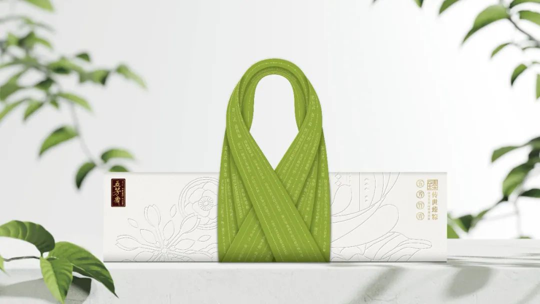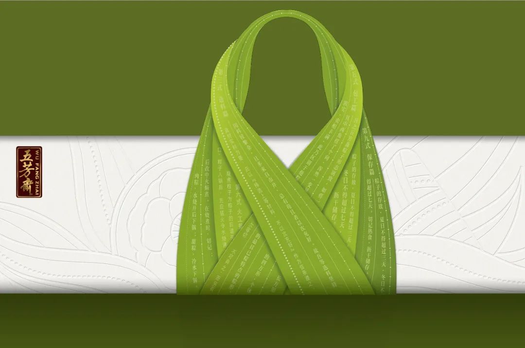 五芳竹青,设计元素采用五芳斋“粽技要秘”为内容,盒子主体采用环保甘蔗为原料,拎手设计理念来之粽叶包裹的穿插艺术,结合“粽技要秘”内容,层次分明。节日食品过度包装一直被人诟病,使用完后的包装垃圾难降解、难处理等问题更是给生态环境造成了严重的影响。为此区别于传统的节日食品包装,五芳竹青粽子礼盒主体采用的是天然植物来源甘蔗渣,不含有塑料,使用完可以在自然环境下100%降解为二氧化碳和水,不给地球增加负担。同时,包装人性化、结构简约化设计、功能多样化的设计,也贯彻了3R的环保理念,清新典雅,令人耳目一新。