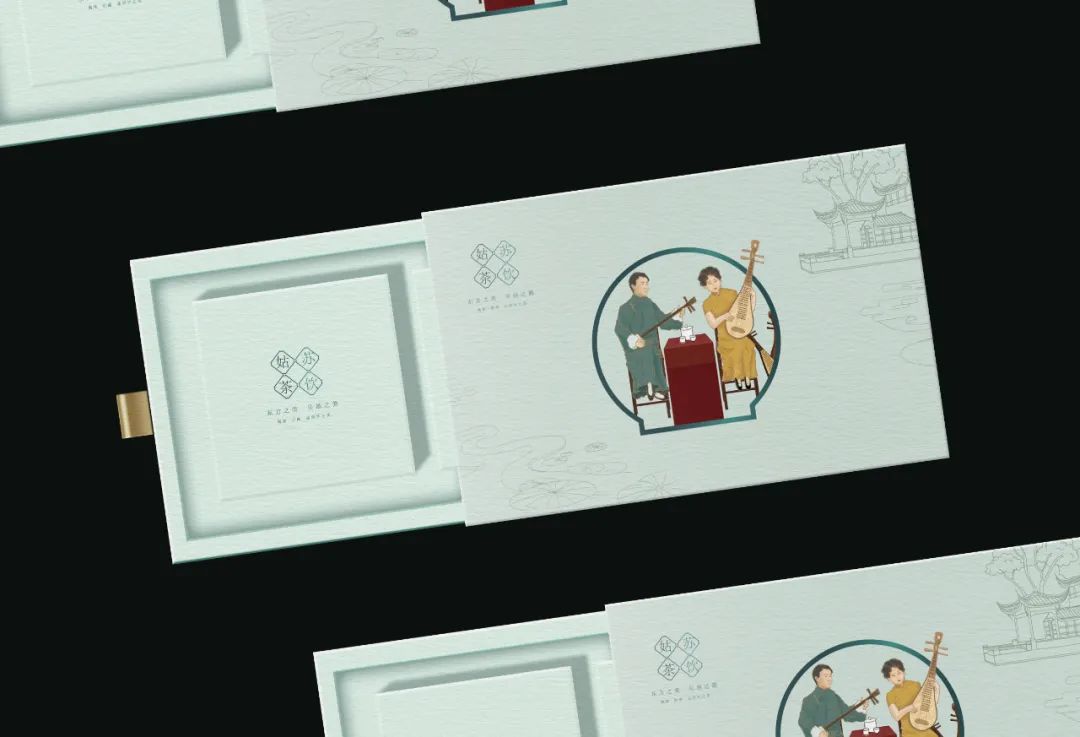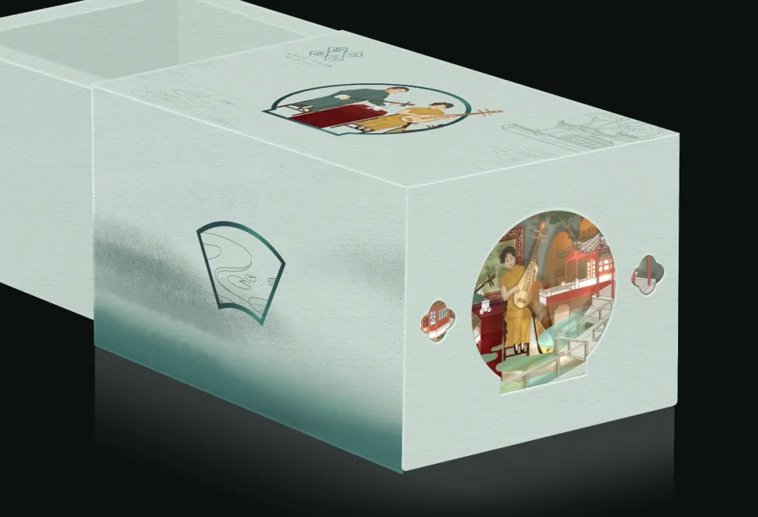 此款礼盒根据茶叶的地域属性结合了苏州园林的建筑特点,试图通过包装展现“以景取胜,景因园异,以小见大”的中国园林的纵深丰富和设计美感。同时包装画面中的苏州评弹的隽永形象试图用形象的语言使感觉转移,使人的视觉、听觉、触觉互相沟通苏州园林核心的建筑特点:通过尺度变换、层次配合和小中见大、以少胜多等技巧手法,将亭、台、楼、阁、泉、石、花、木融合在一起。礼盒采用了特殊结构再现了这一特点。组合多层印有苏州园林单个建筑元素的组件,联动开启。当消费者在缓缓拉开礼盒时,层层组件随之缓缓拉伸形成景深效果,同时亮起暖色灯光,消费者可从侧面月门观察到一幅充满细节的园林庭院深处的悠扬评弹图,似乎还能听到那吴侬软语的轻吟浅唱,意境深远,趣味绵长。