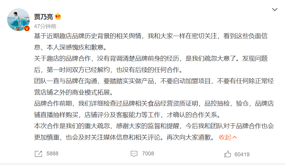 今日,明星贾乃亮、前《奇葩说》冠军辩手傅首尔通过微博回应了与趣店的合作,并发表道歉声明。此合作系上周举办的“趣店预制菜”抖音直播带货活动。
