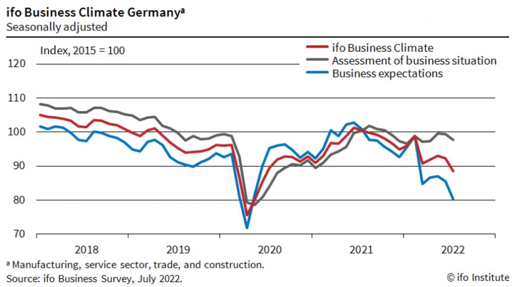 伊福经济研究所(Ifo)周一公布的数据显示,德国7月商业景气指数从6月的92.2下降到88.6,低于预期的90.5,跌至2020年6月以来最低。