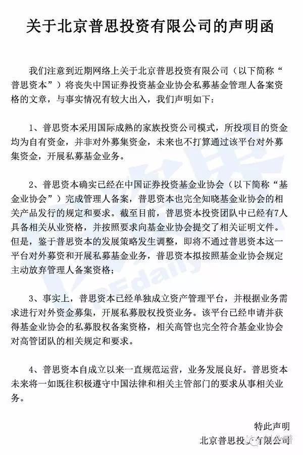 近日,有媒体报道称,“普思资本将丧失中国证券投资基金业协会私募基金管理人备案资格”,这就意味着这家2009年注册的由王思聪100%控股的私募股权公司,将被注销!!!