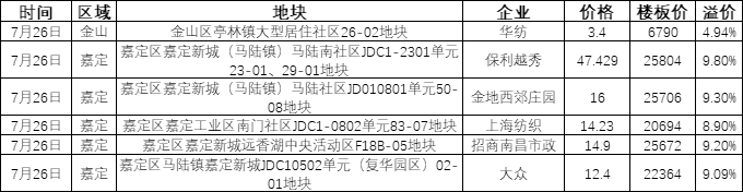 7月26日,上海完成6幅地块出让,当天共计收获108亿。本次出让地块来自嘉定和金山,其中嘉定5幅地块竞争激烈,溢价率接近极限10%。