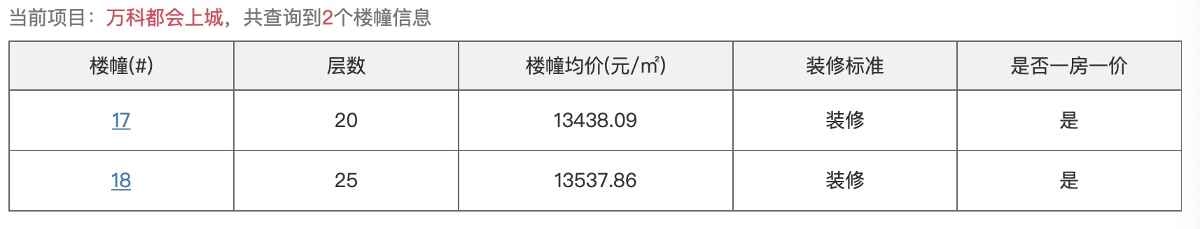 7月26日,万科都会上城17#、18#楼价格公示。本次公示的17#楼共计20层,均价13438元/㎡,18#楼25层,均价13537元/㎡,均为装修产品,面积区间约为89-120㎡。