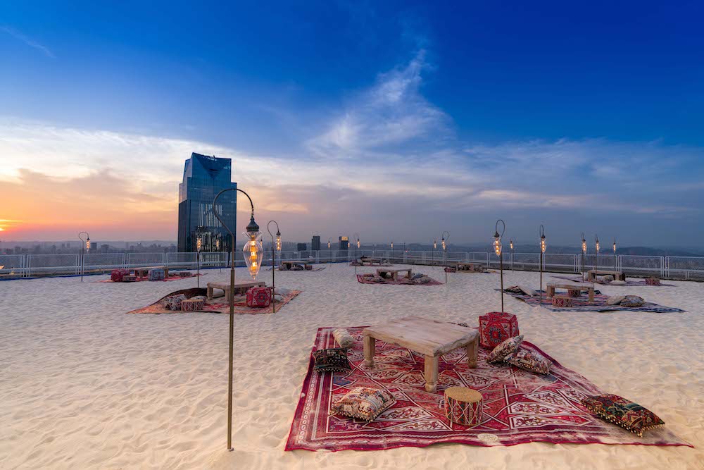 入夏之际,重庆威斯汀更是巧思别出,将36吨白沙从海南空运入渝,在酒店57层停机坪打造出了一个空中沙滩派对,进入其中,恍然置身于中东沙特沙滩之中。这里不仅是独有的高空沙滩派对,更得益于其优越的地理位置,目光所及皆是璀璨的山城夜景与城中斜阳。威斯汀都市沙滩派对将持续到10月底结束,有计划去山城度假游玩的朋友不妨去试试这一独特的高空打卡点。