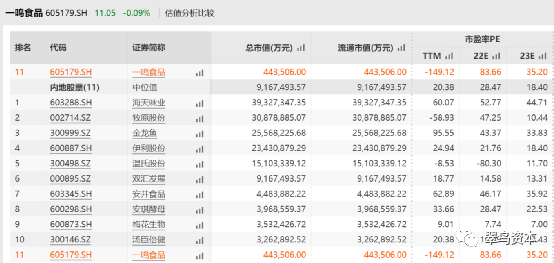 比较市盈率TTM,即以最近报告的12个月(四个季度)的净利润或者每股收益为基础来计算的数值。如下图所示,一鸣食品直接进入了负值地带,与可比公司股票的中位值相差100倍,几乎产生了“爆表”效应。