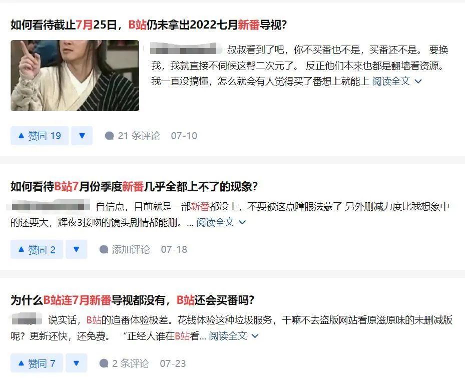从几年前的国内新番版权大户,到如今新番大量缺席产生的极大落差,不由得让动漫爱好者们唏嘘。“这或许就是先审后播的最终结果吧!”“我是‘正版受害者’,看番早就不去B站了。”“是不是还在审?现在只有确定过审的新番,B站才会挂出页面了。”“7月新番值得买的不多吧……如今B站买番都冲着破圈去的。”相较于B站上的其它版权内容,新番总是充满着太多不确定性。包括数次自审自查下架大量动画,LEX事件,以及“先审后播”,打码抠图,在核心动画观众看来,番剧区如今的问题,是B站急于“破圈”必然付出的代价。