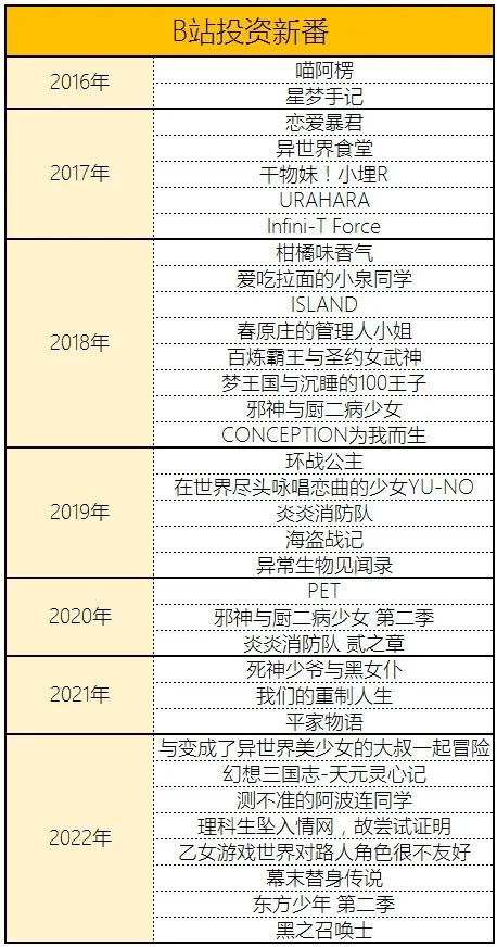 2016年,B站收购日本动画企划、制作Children's Playground童园为全资子公司。在2015年爱奇艺投资《龙心战纪》的过程中,制作委员会中担任制片公司也正是童园。正是通过童园,B站进入了30多部新番制作委员会。这些作品如下表所示。