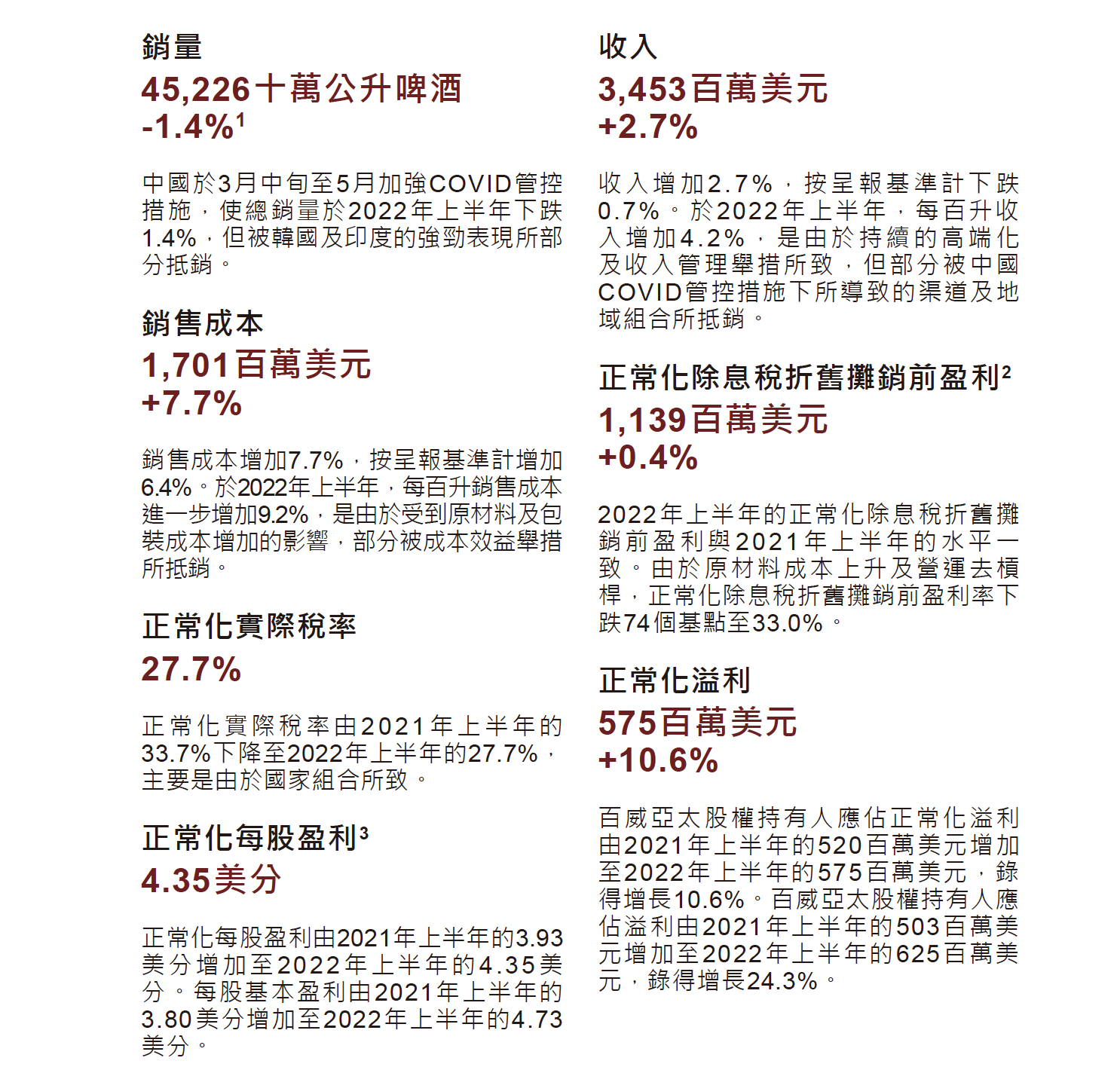 对于成本提升,百威亚太指出,于2022年上半年,每百升销售成本进一步增加9.2%,是由于受到原材料及包装成本增加的影响,部分被成本效益举措所抵销。