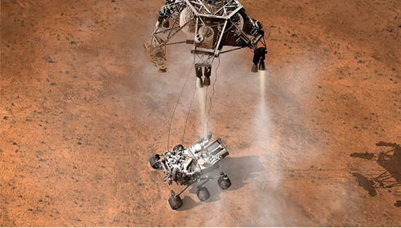为了使“好奇号”安全度过“惊险七分钟”,研究人员还专门设计了“空中吊车”,这一系统可以在探测车降落的最后阶段减慢速度,从而缓缓地降落到火星表面。不过为了保证“空中吊车”火箭引擎的火苗在扩散情况下不会烫坏探测车或用于固定探测车的套具,西门子的PLM软件又一次起到了重要的模拟作用。