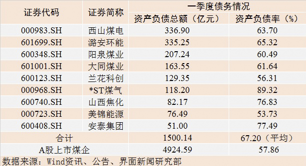 根据Wind资讯提供的数据显示,9家“山西系”上市煤企今年一季度合计负债总额为1500.14亿元,占据同行业上市企业负债总额的30.46%。其中,西山煤电一季度负债总额最高,为336.90亿元。潞安环能(601688.SH)负债总额居次,为335.25亿元。