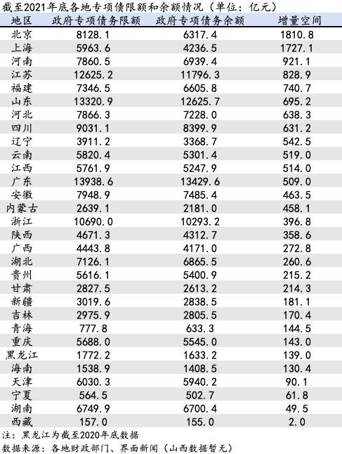 根据界面新闻对31个省区市债务余额的考察,除山西省数据不全外,截至2021年底,北京、上海两市限额内分别有超过1500亿元的存量专项债额度可使用,“家底”较厚,而绝大部分省份均不足500亿元。其中,天津、宁夏、湖南、西藏可使用的存量专项债额度甚至不到100亿元,最少的西藏仅有2亿元。
