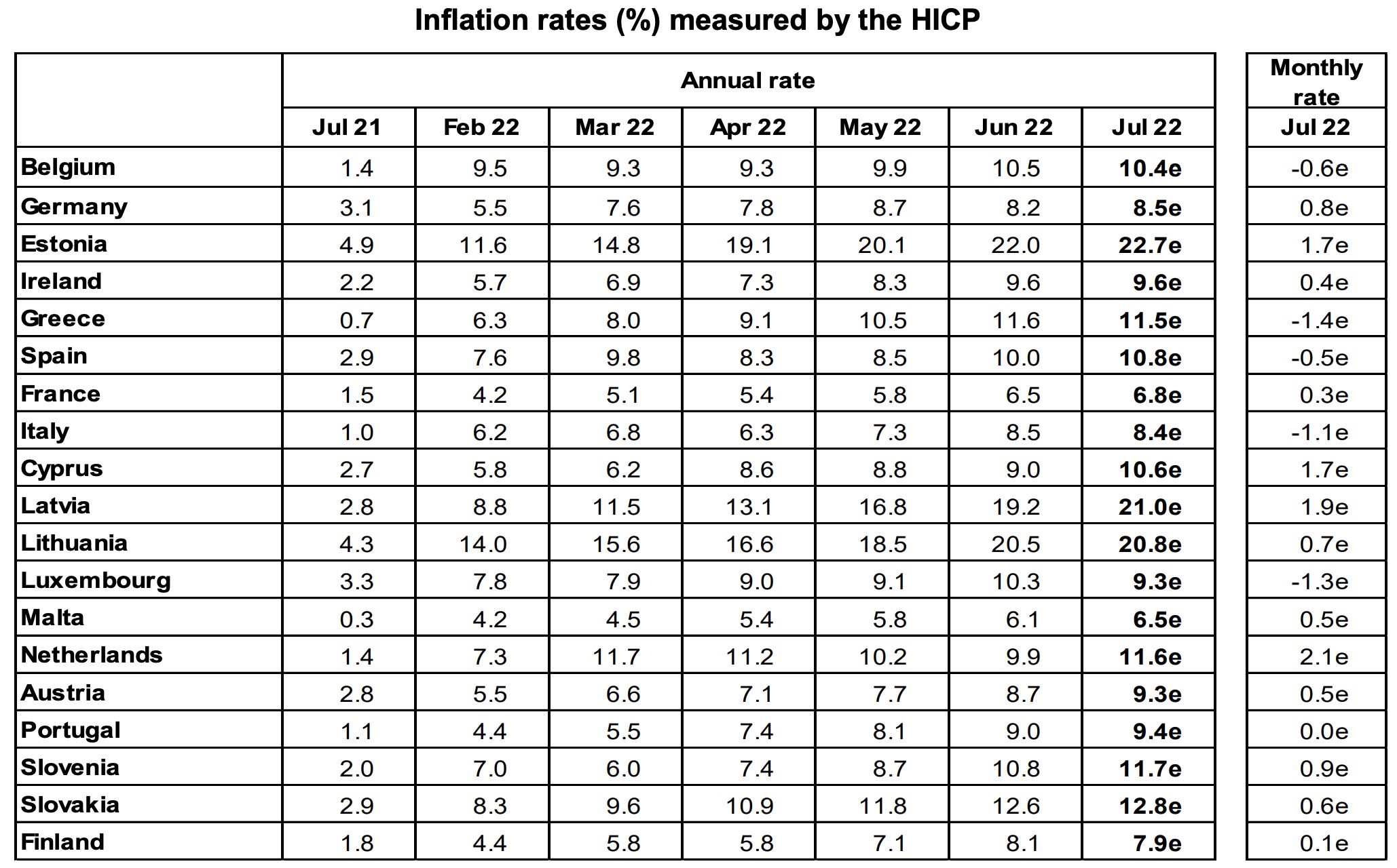 19个欧元区成员国之中,对俄罗斯能源依赖度最高的波罗的海三国依然领跑通胀排行榜,爱沙尼亚、拉脱维亚、立陶宛7月的通胀预估值分别为22.7%、21%、20.8%;核心成员国之中,德法意三国的通胀预估值则分别为8.5%、6.8%、8.4%。