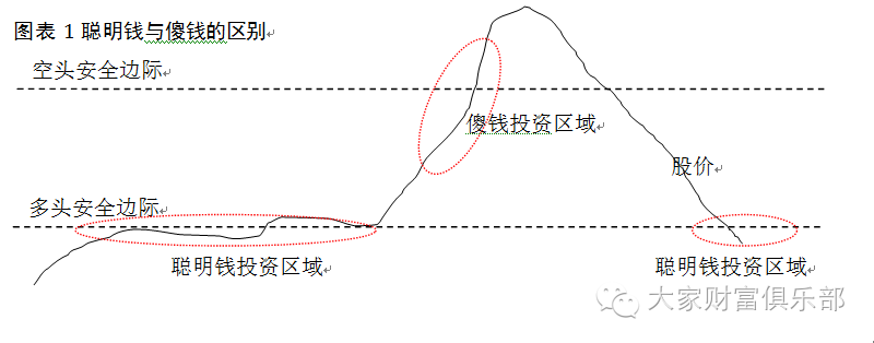 在股票市场上有聪明钱和傻钱之分。简单的说,傻钱就是对一个毫无价值的投资标的疯狂的追求,好比牛顿炒南海公司的股票。而聪明钱非常清楚他所投资的标的具有多大的价值,并在多头或者空头安全边际下进行投资。我们用下图来解释傻钱和聪明钱之间的关系。我们拿多头来讲,由于聪明钱非常清楚一家公司的多头安全边际在哪,所以,当市场先生情绪非常低落时,股价跌破了多头安全边际,聪明钱这时就会逐步的加大投资。而傻钱不清楚多头安全边际在哪,所以傻钱只能看股价上涨的很多了之后才开始做出买入的投资决策。至于多头安全边际如何确定,请读者自己去阅读格拉罕的《证券分析》。