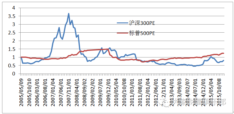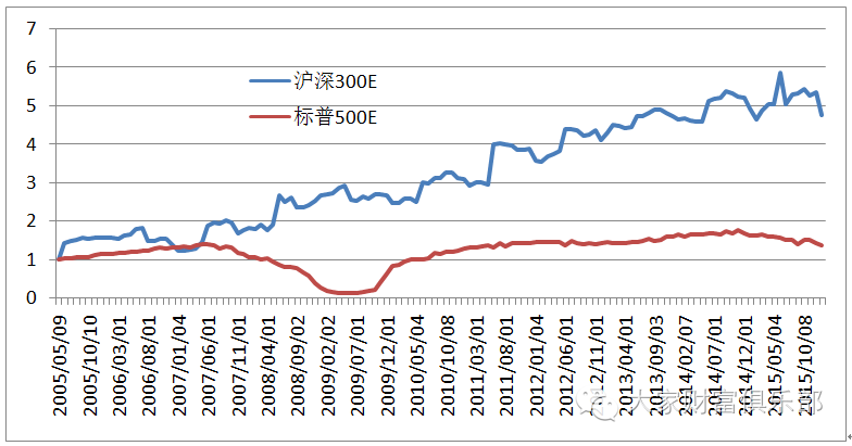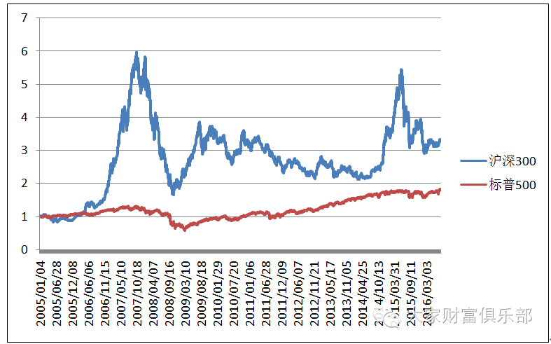 笔者再举一个实际的例子,我们把沪深300与标普500自2005年1月4日~2016年7月27日这段时间的数据拿来分析。两者对比如下: