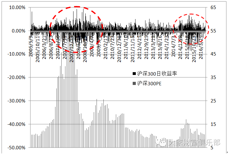 股票的价格是一个稳定系统,这个系统在估值越高的时候越会表现出不稳定性,我们观察沪深300指数的日收益率,在主要的高估值区间都会表现出日收益率波动性放大的现象。