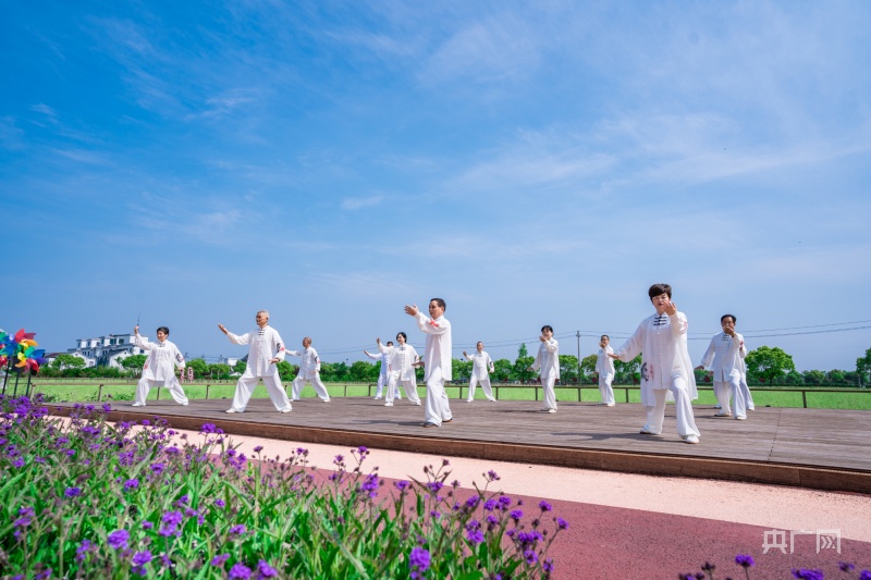 桐乡市屠甸镇荣星村村民在田园中锻炼身体(央广网发 荣星村供图)