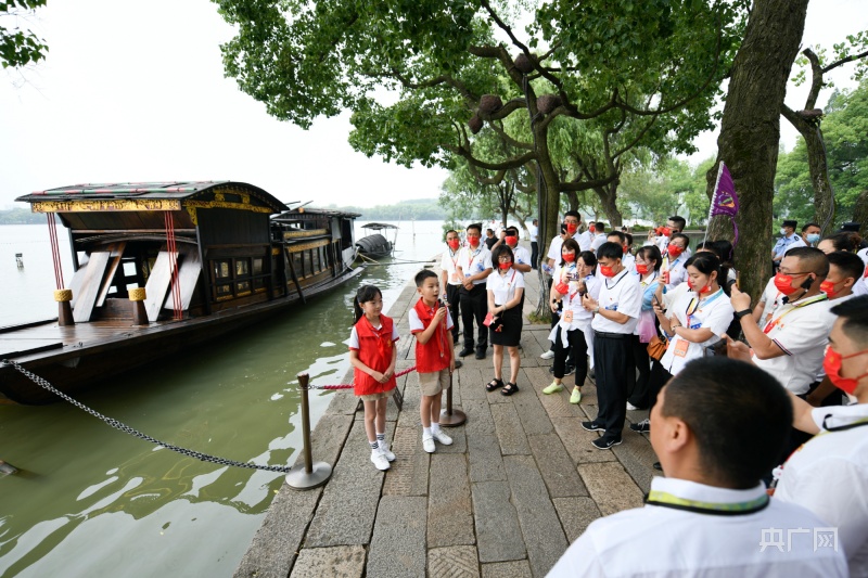 “小讲解”为参观南湖红船的游客们讲述“红船故事”(央广网发 王振宇 摄)