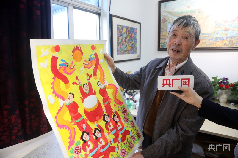在嘉兴市秀洲区胜丰村,坚持农民画创作20多年的张金泉介绍自己的作品(央广网记者 魏炜 摄)