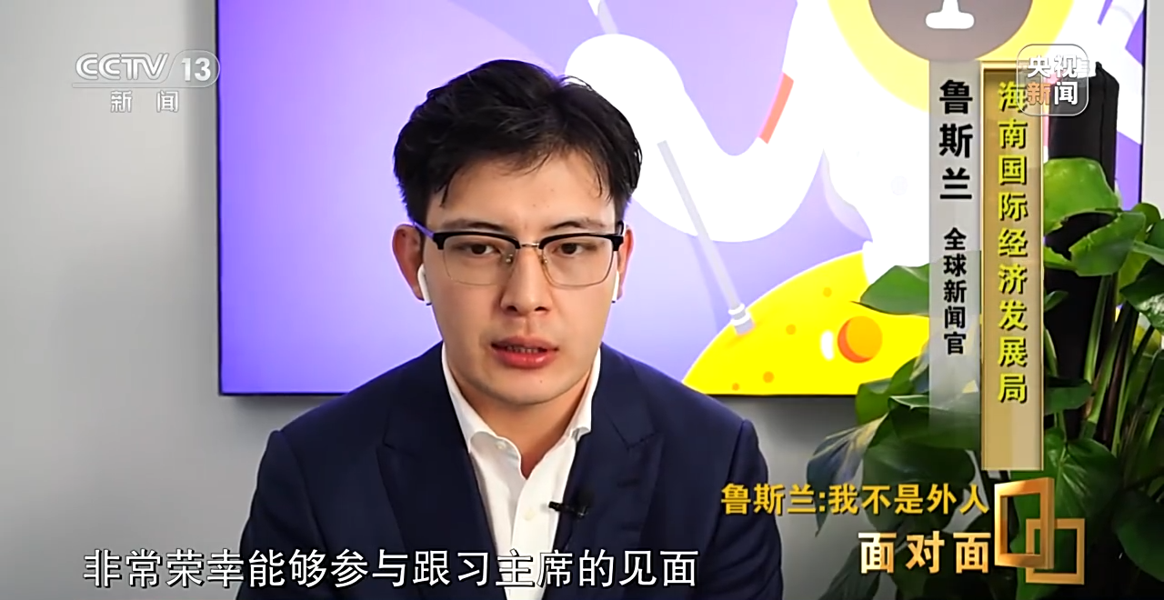 鲁斯兰:我今年4月12日在海南的洋浦港,非常荣幸能够参与跟习主席的见面和简单的交流。习主席他夸我的中文好,完全是中国通,我觉得让我很荣幸。我也感谢了习主席,这是我等待了十年的梦想,当天我实现了我的愿望。