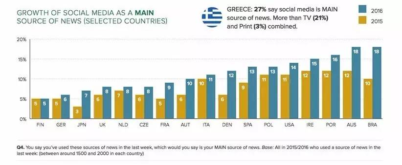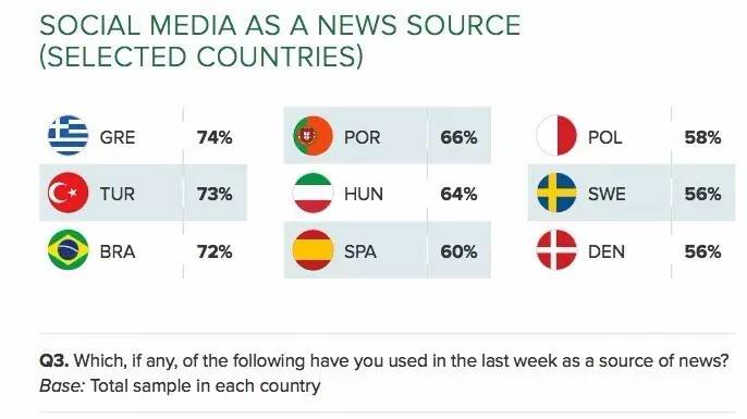 虽然不同国家对信息的消费偏好有所不同,但就全球用户而言,社交媒体已成为获取信息的主要渠道。在这其中,希腊、土耳其和巴西成了当之无愧的社交媒体重度使用国家。