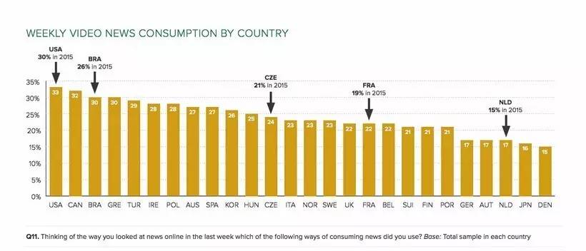 就各国使用情况来看,美国用户对视频信息消费的渗透率最高,为33%,相比之下,欧洲各国的这一比例平均水平仅仅为22%。美国的这一高视频信息消费渗透率主要得益于美国出版业巨头在视频内容上花费的巨大精力(尽管视频信息消费领域增速缓慢)。路透社预计,未来这一比例还将持续增长,所以,对那些将视频内容纳入战略规划的公司而言,尽管这一领域增速缓慢,但却不用太担忧。