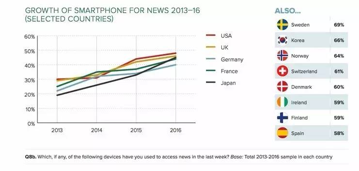 过去几年,智能手机的普及率急速上升,根据路透社调研数据,53%的被调研者都表示,会通过智能手机端获取信息,这一比例在瑞典为69%、韩国为66%,瑞士为61%,比例相对最高。