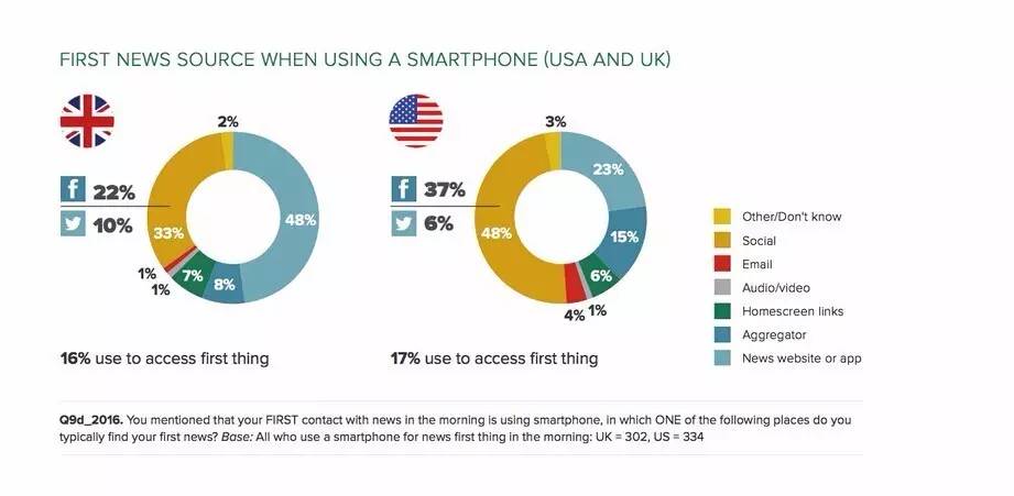 对比英国和美国用户通过智能手机进行信息消费时的第一通道,有趣的是:英国用户更倾向于使用专门的信息网站,而美国则有48%的用户都选择社交媒体作为入口。