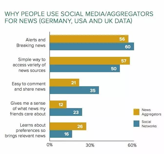 就整个欧洲市场而言,有46%的欧洲用户都通过社交媒体来获取信息,英国和德国的这一比例分别为35%和31%,与希腊、葡萄牙和爱尔兰较为接近。