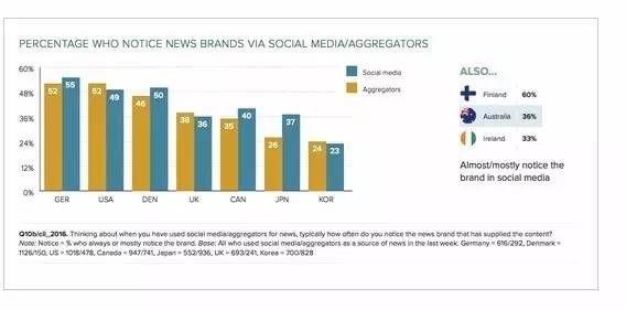 而令人担忧的一点是,随着社交媒体和信息聚合App使用率的不断提升,一些用户很可能不会去关注信息发布的品牌主。而就芬兰和德国而言,用户对品牌的认知度很高,分别为60%和55%。相比之下,澳大利亚和爱尔兰较低,分别为36%和33%。而在日本和韩国,这一比例更低。