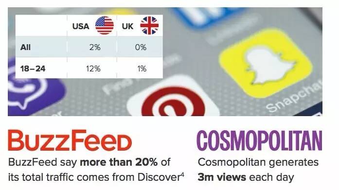 如果这些都还不足以使Snapchat对发行商们造成极大的吸引力,那么来看一组数据,Buzzfeed20%的流量都来自Snapchat。 Cosmopolitan 在Snapchat上的日浏览量超过300万。
