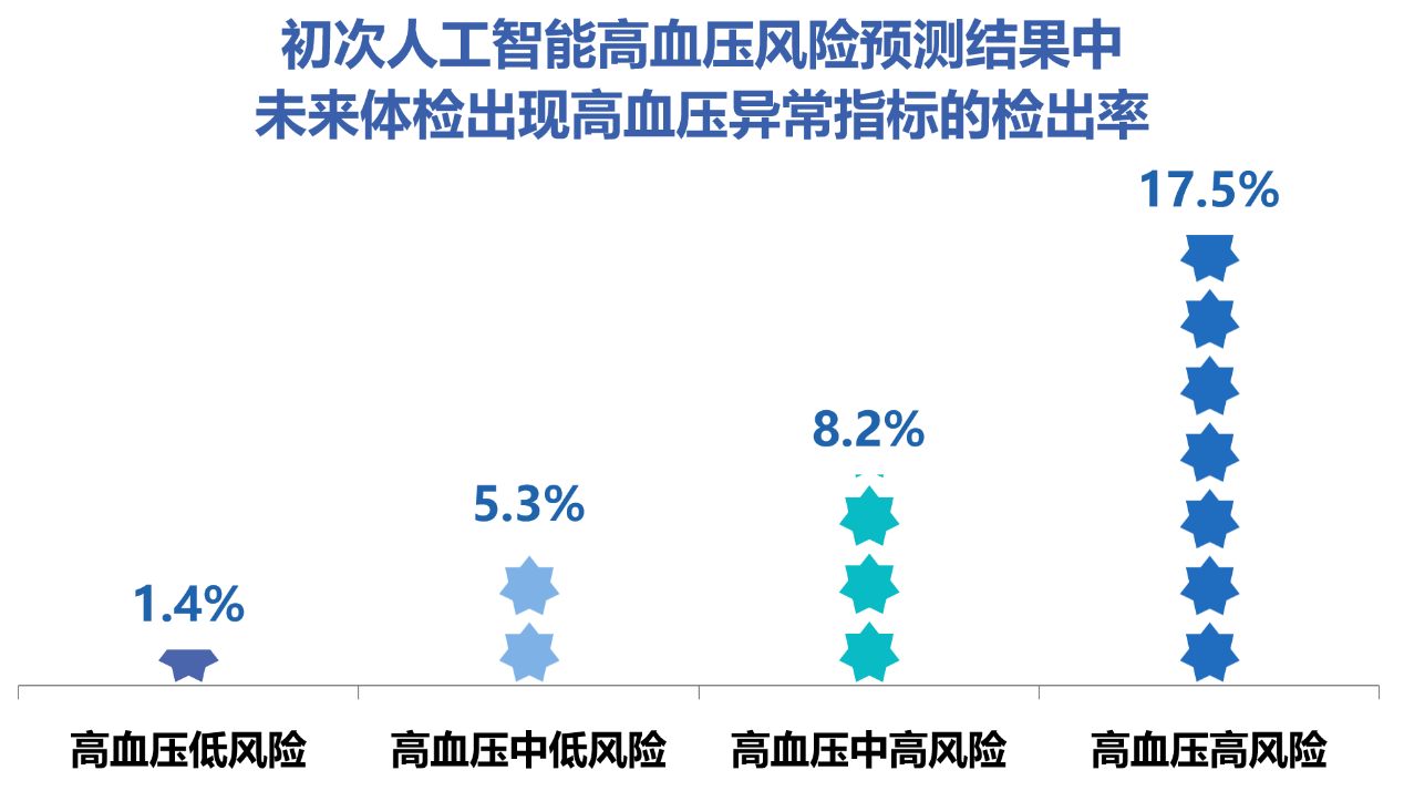 结果显示,初次评估时相关疾病风险预测结果显示等级越高的人群,未来越容易在体检过程中出现相关疾病指标异常。其中,在初次高血压风险预测结果显示中高风险及以上人群,未来体检出现高血压异常指标的检出率高达25.7%。