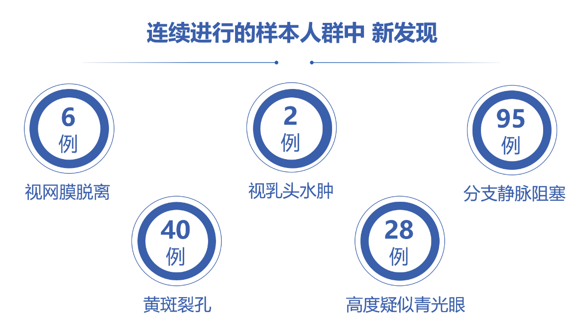 在连续进行视网膜人工智能评估的样本人群中,累计新发现171例威胁视力的重大阳性疾病。其中,视网膜脱离6例;视乳头水肿2例;分支静脉阻塞95例;黄斑裂孔40例;高度疑似青光眼28例。