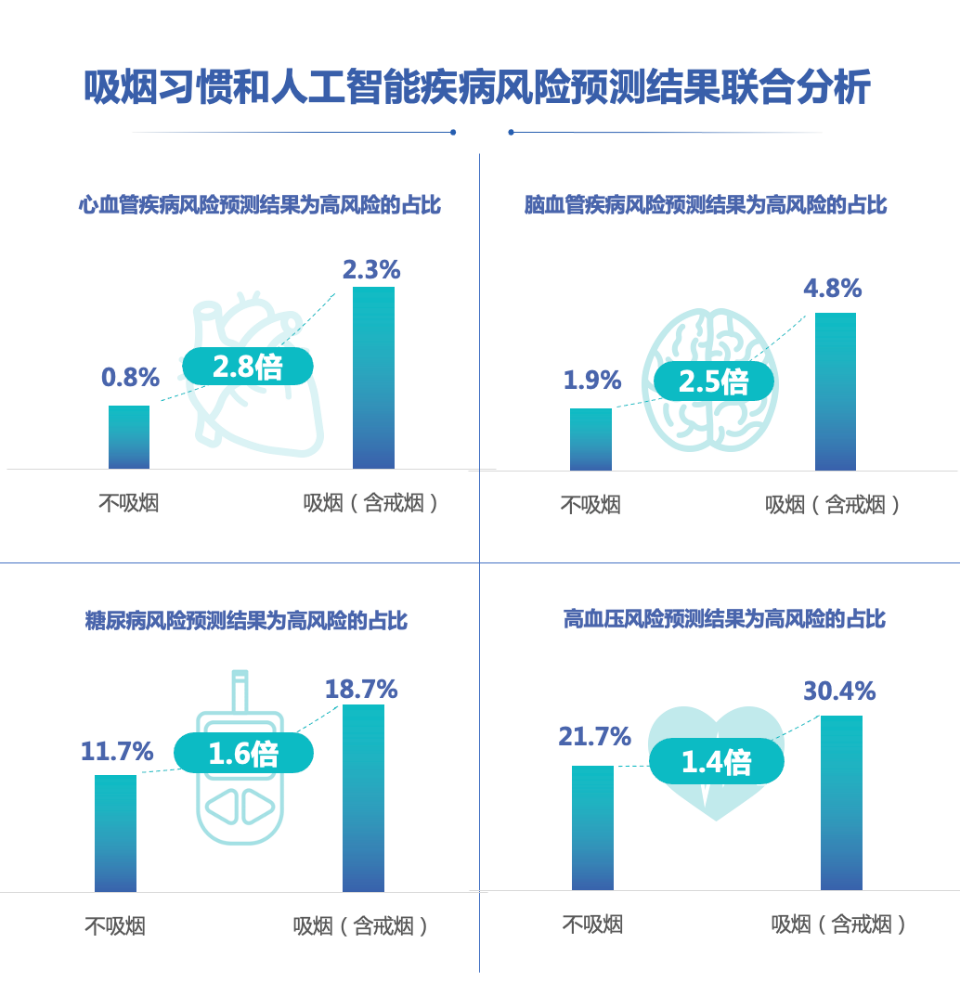 “吸烟”和“吸烟(含戒烟)”的体检人群心血管、脑血管、糖尿病和高血压高风险占比分别是“不吸烟”的体检人群的2.8倍、2.5倍、1.6倍、1.4倍。吸烟会增加相关慢性病患病风险。