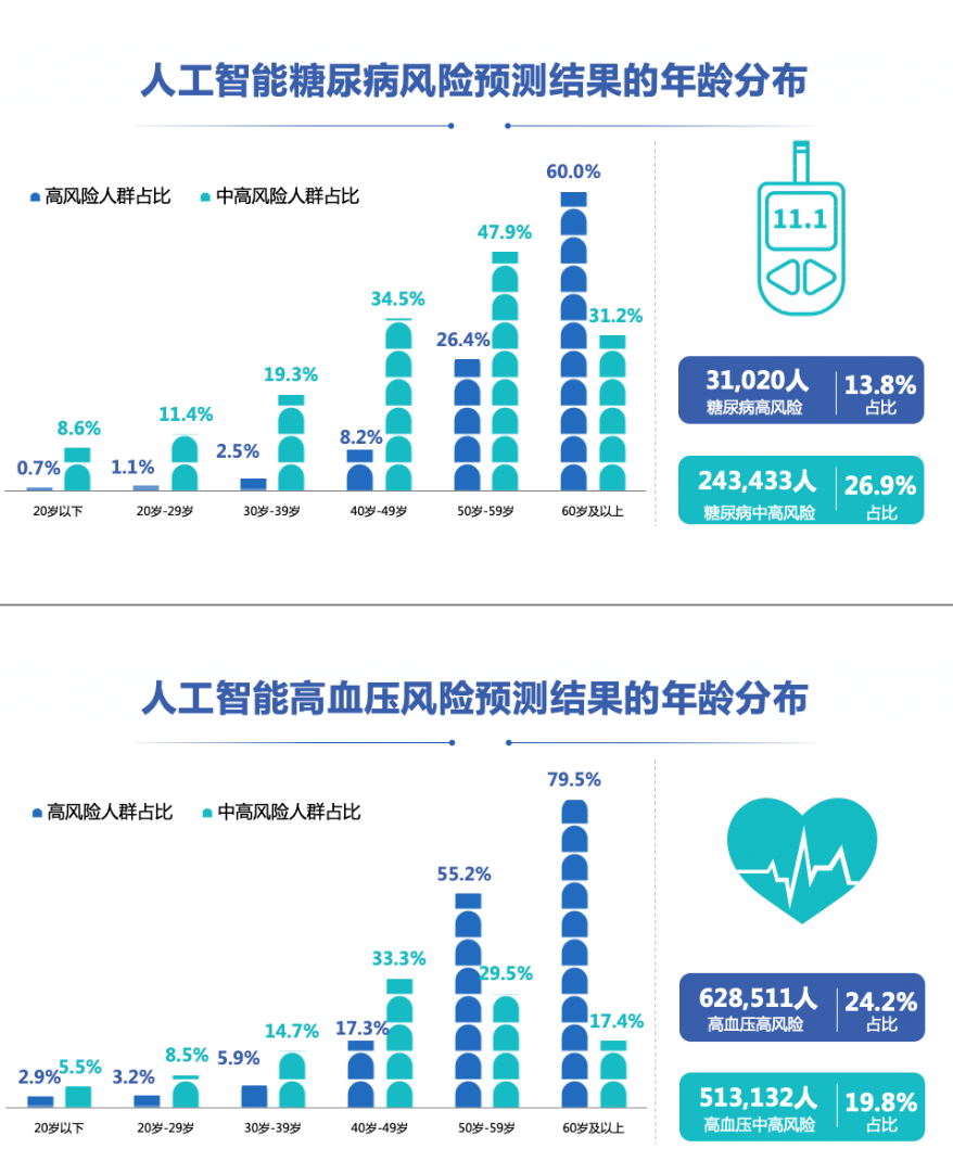 在本次记录糖尿病、高血压风险预测结果的样本人群中,糖尿病高风险检出357,291人,占比为13.8%,糖尿病中高风险检出697,136人,占比为26.9%;高血压高风险检出628,511人,占比为24.2%,高血压中高风险检出513,132人,占比为19.8% 。