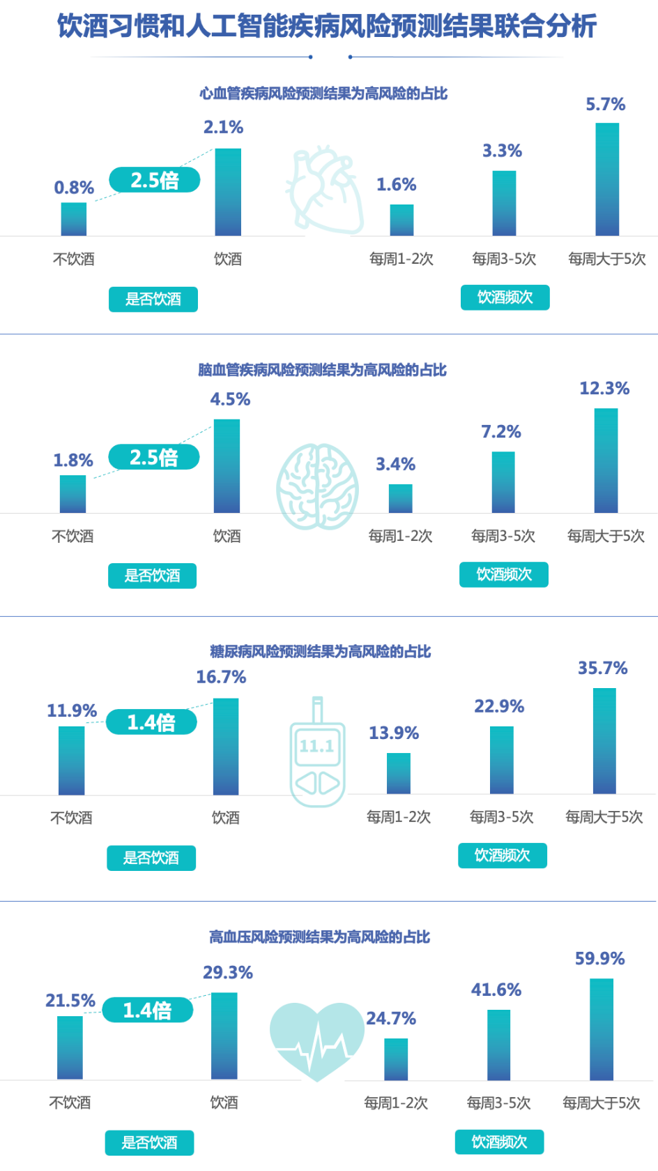 “饮酒”的体检人群心血管、脑血管、糖尿病、高血压高风险占比分别是“不饮酒人群”的2.5倍、2.5倍、1.4倍、1.4倍,且饮酒频次越多,高风险占比越高。饮酒会增加相关慢性病患病风险。