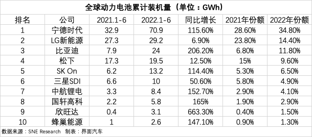 排名前十的企业中,中国企业达到6家,除了宁德时代和比亚迪,还有分别排名7至10位的中创新航、国轩高科、欣旺达以及蜂巢能源。6家中国企业市场份额合计56.4%。
