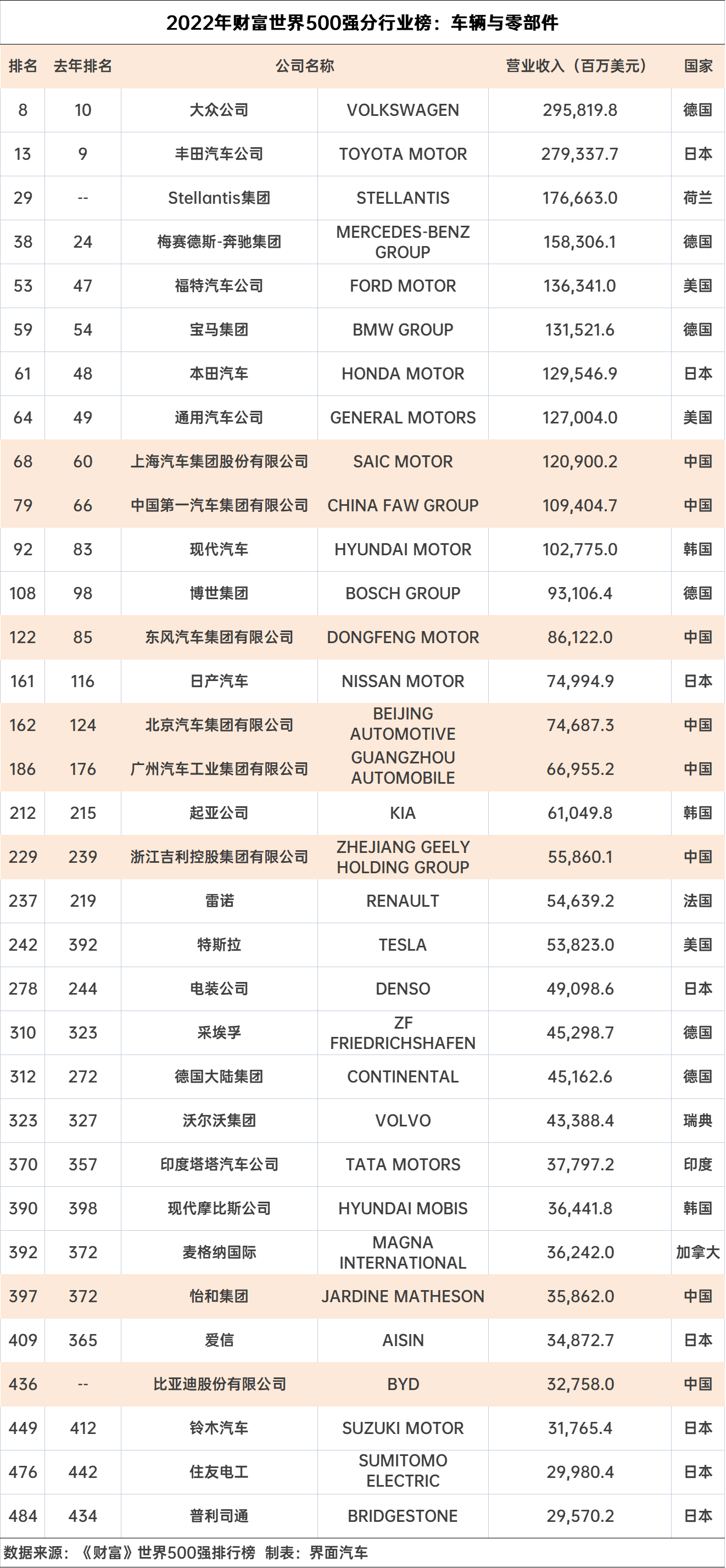 此次榜单中,全球营收前十的汽车生产商,德国占3席、日本占2席、中国占2席、美国占2席、荷兰占1席。