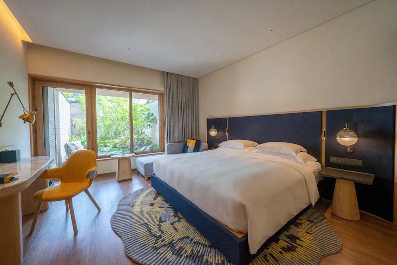 山水园林设计元素与voco鲜亮明快的品牌经典色相融,编织、陶瓷、金属艺术品和voco吉祥物装饰相映,自然和时尚气息流淌于酒店的18栋126间客房中。